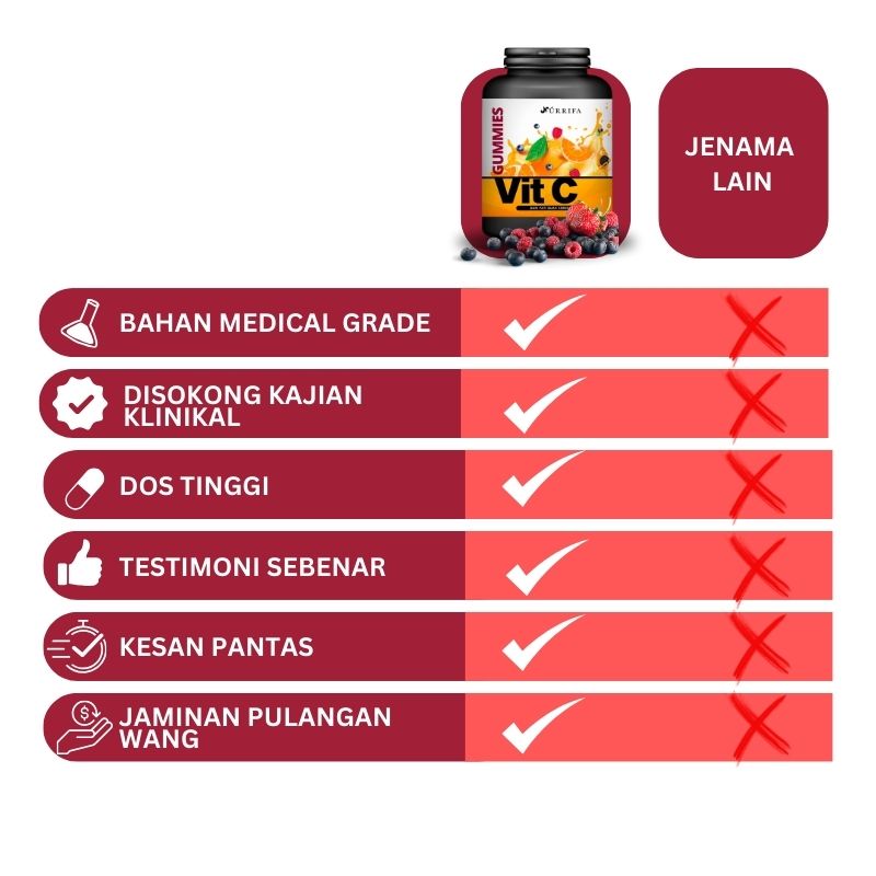 Jangan cepat untuk terus risiko kan kulit wajah anda dengan suplimen ajaib diluar sana sedangkan Nurrifa Gummies VitC ini diformulisasikan mengikut kajian perubatan antarabangsa yang diyakini dan berdasarkan sains.